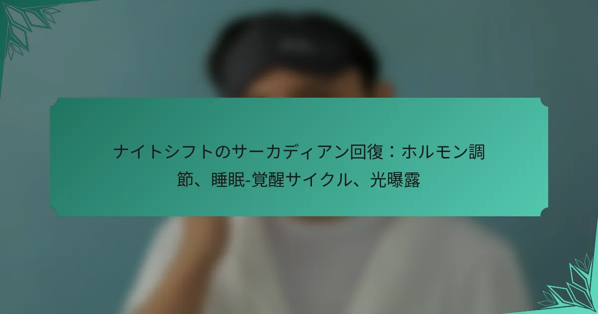 夜勤はホルモン調節や睡眠-覚醒サイクルに重大な課題をもたらし、主にメラトニンやコルチゾールのレベルに影響を与えます。これらの乱れは、睡眠障害や認知機能の低下を含むさまざまな健康問題を引き起こす可能性があります。夜勤労働者にとって、光の曝露を効果的に管理することが不可欠であり、メラトニンの生成を促進し、サーカディアンリズムの回復をサポートします。